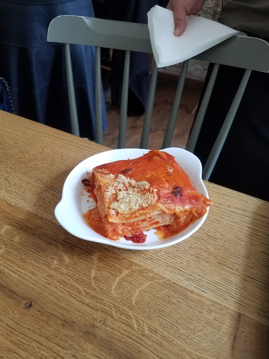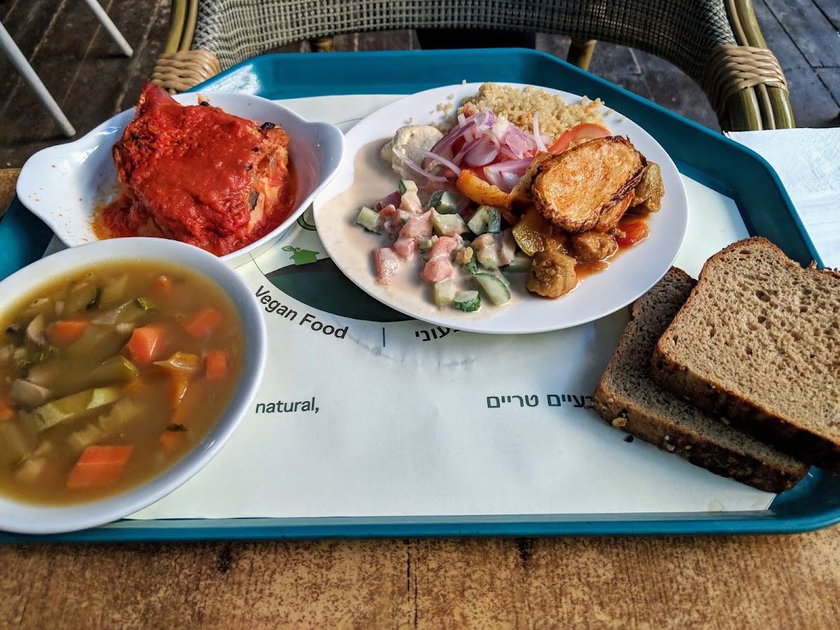 This place really knows what it's doing. It's such a dependable spot. The food is filling and very diverse. It's a great example of veganism run by people who understand that veganism is not just a bunch of veggies and tofu. Dishes are inventive and filling. The lady behind the counter was great. She's just super fast and efficient and you feel like she's got you covered and safe. I came up to the counter with my plate of food from the buffet and she said, "Go put more food on your plate. You're paying 44 shekels for that; you need to get your money's worth." Isn't that hilarious and great?! As I was leaving, I handed my tray to the lady and she says, “Do you want me to package your pie slice to go?” I said, “Oh no thanks.” She said, “But you only took one bite!” I said “Well, I'm afraid I didn't care for the pie.” And she said, “Well, choose something else! You paid for a dessert, you should get something you like.” And she packaged it up for me. It was very Israeli mother. I come here whenever I vacation here and I always leave satisfied.